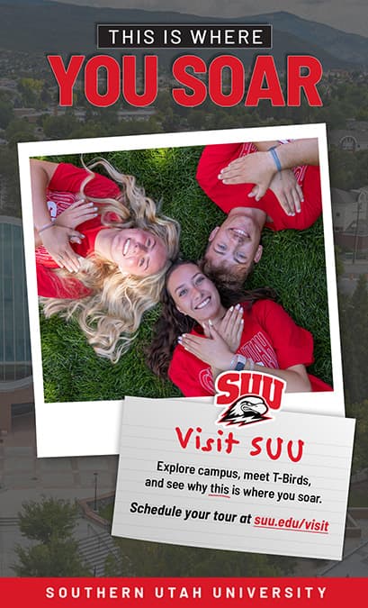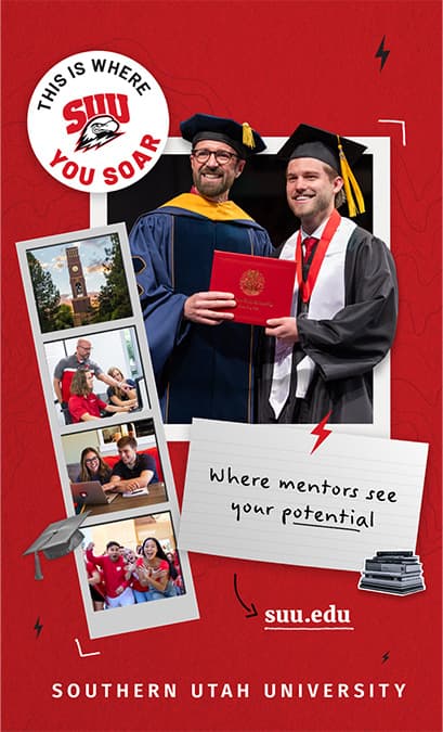 At Southern Utah University, this is where you soar! This is where you realize your potential with personalized guidance from faculty, staff, peer mentors, and friends who believe in you. Even when the journey seems uncertain, you'll face challenges with confidence, knowing you have a supportive community cheering you on. This is where every project, course, and obstacle becomes an opportunity to achieve more than you thought possible. With hands-on, career-focused learning, you gain practical experience that sets you apart. In an atmosphere charged with ambition and possibility, those simple notes of encouragement and moments of genuine care make all the difference. Here, you don't just fly—you soar.