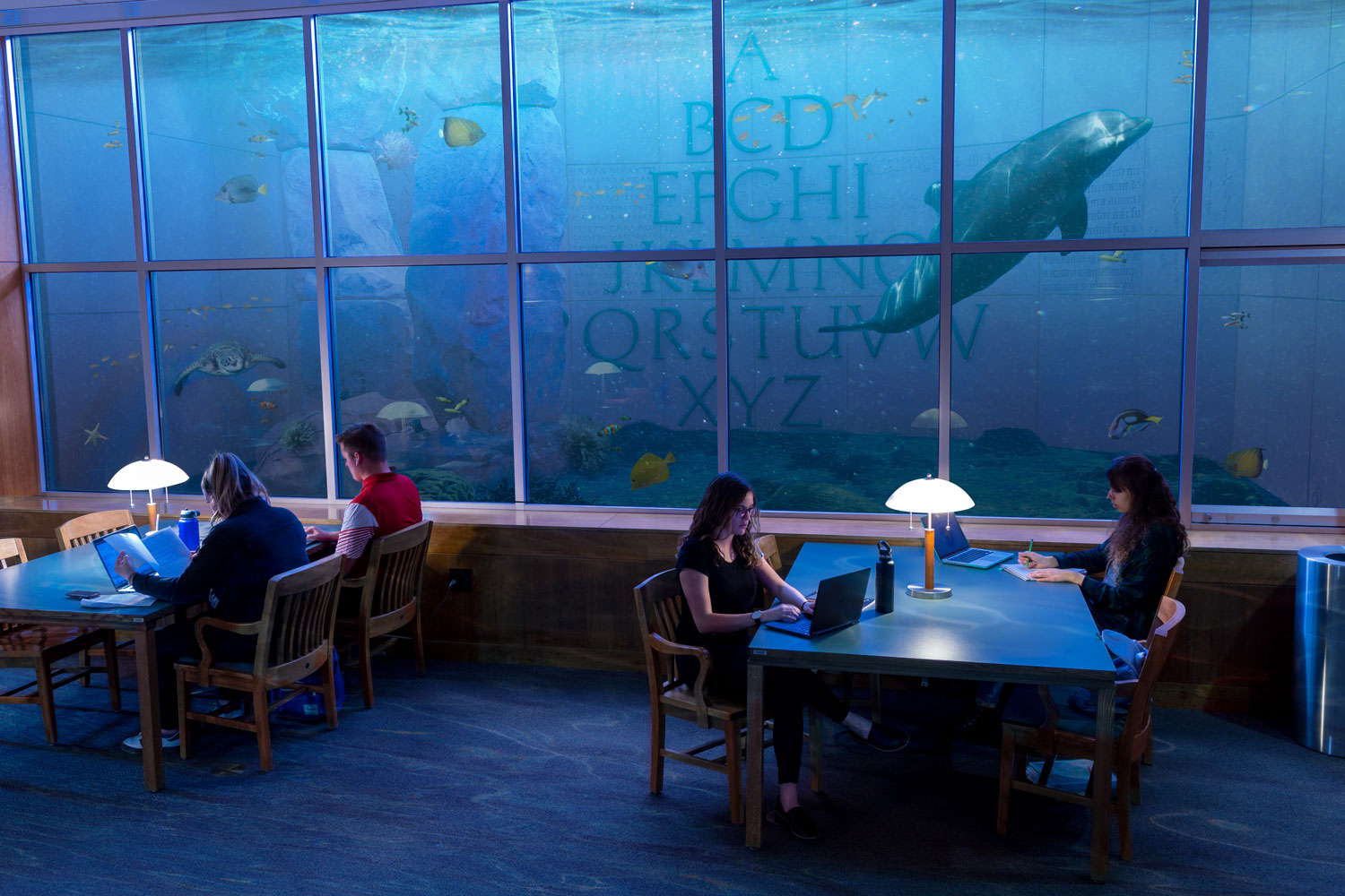 The aquarium will be incorporated into the current ‘Garden of Symbols’ art structure visible from above in the library plaza and directly visible from the basement level of the library. Current renovations on the new Geosciences Building have allowed an underground, underwater study tunnel to connect the two buildings complete with desks and outlets, providing students an immersive and therapeutic experience with the aquarium.